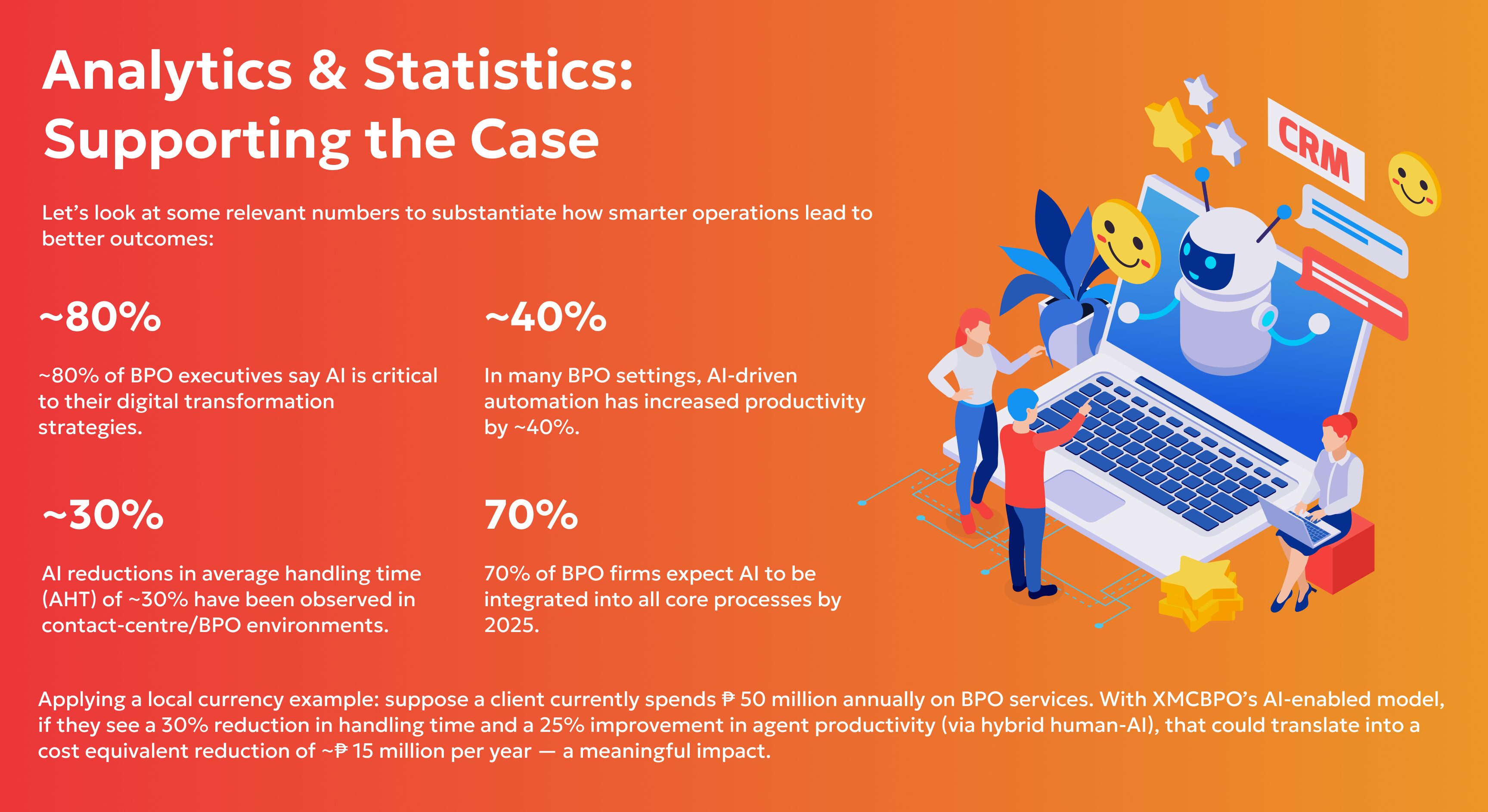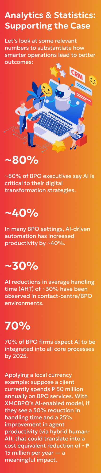 In the Philippines, where outsourcing is a major industry, the difference measured in pesos can be significant. Millions of pesos in saved cost, improved service quality, faster time-to-market and scalable growth. For companies ready to move beyond traditional outsourcing and embrace intelligent operations, XMCBPO stands out as a partner who delivers big.