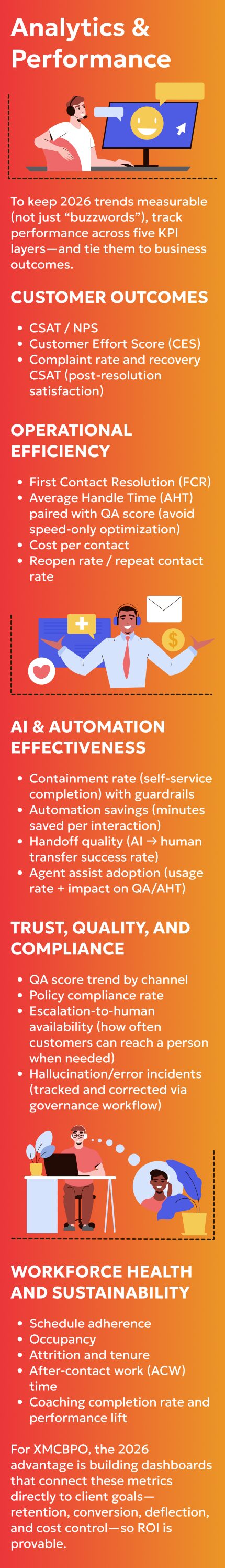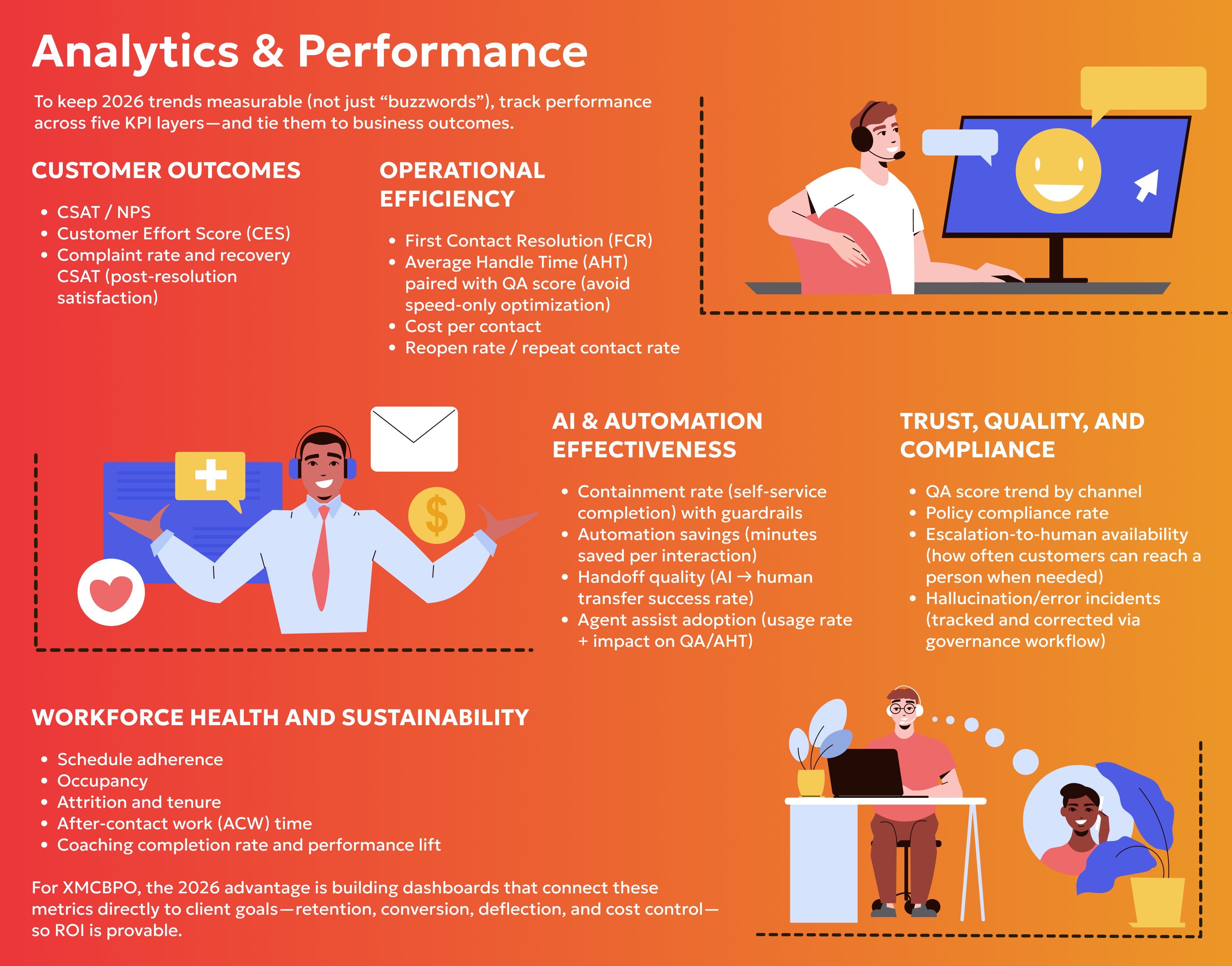 As AI use grows, so does scrutiny. In 2026, trust becomes a CX advantage: transparency, escalation options, privacy controls, and consistent policy enforcement. XMCBPO can support clients by operationalizing governance—through QA frameworks, compliance monitoring, and “human-in-the-loop” approval for sensitive actions.